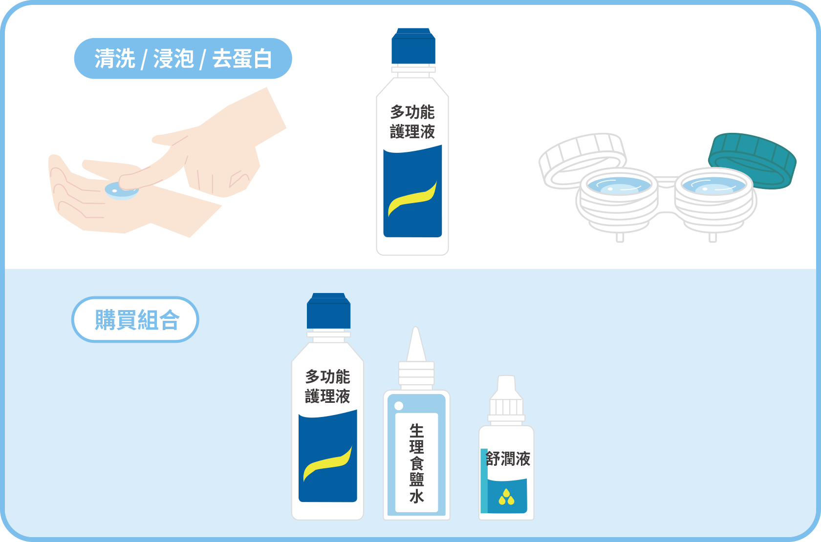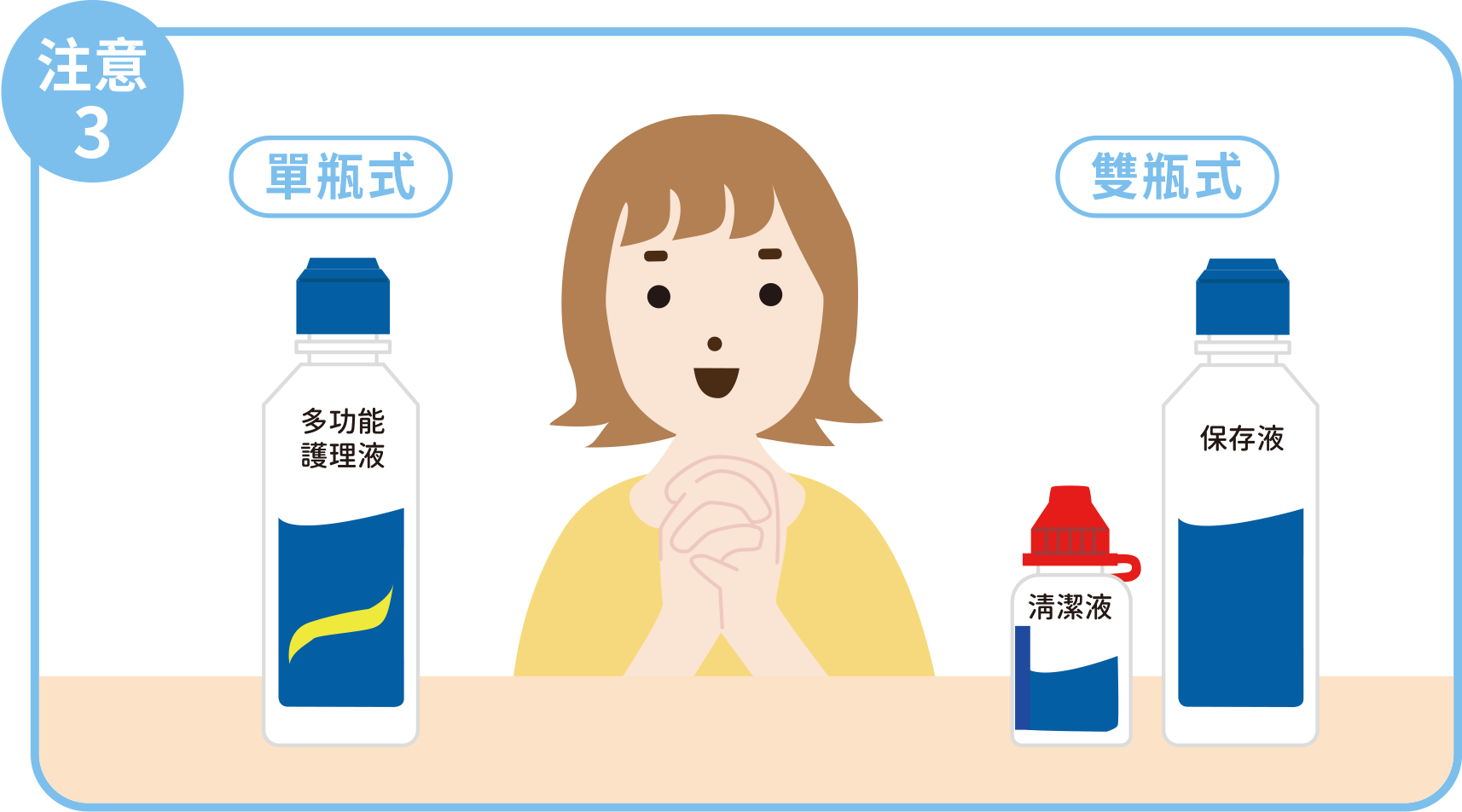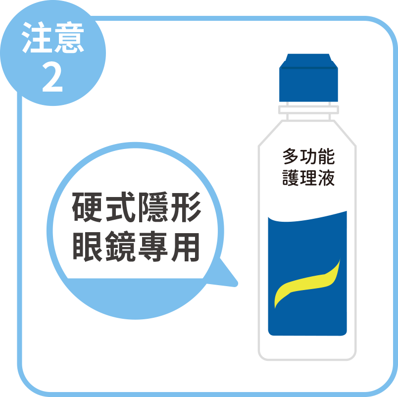 軟、硬式隱形眼鏡材質迥異,保養液、護理液的清潔及殺菌成分也不同,因此建議使用硬式專用的多功能護理液或是清潔液,來達到最佳的配戴舒適度和清潔、殺菌效果。