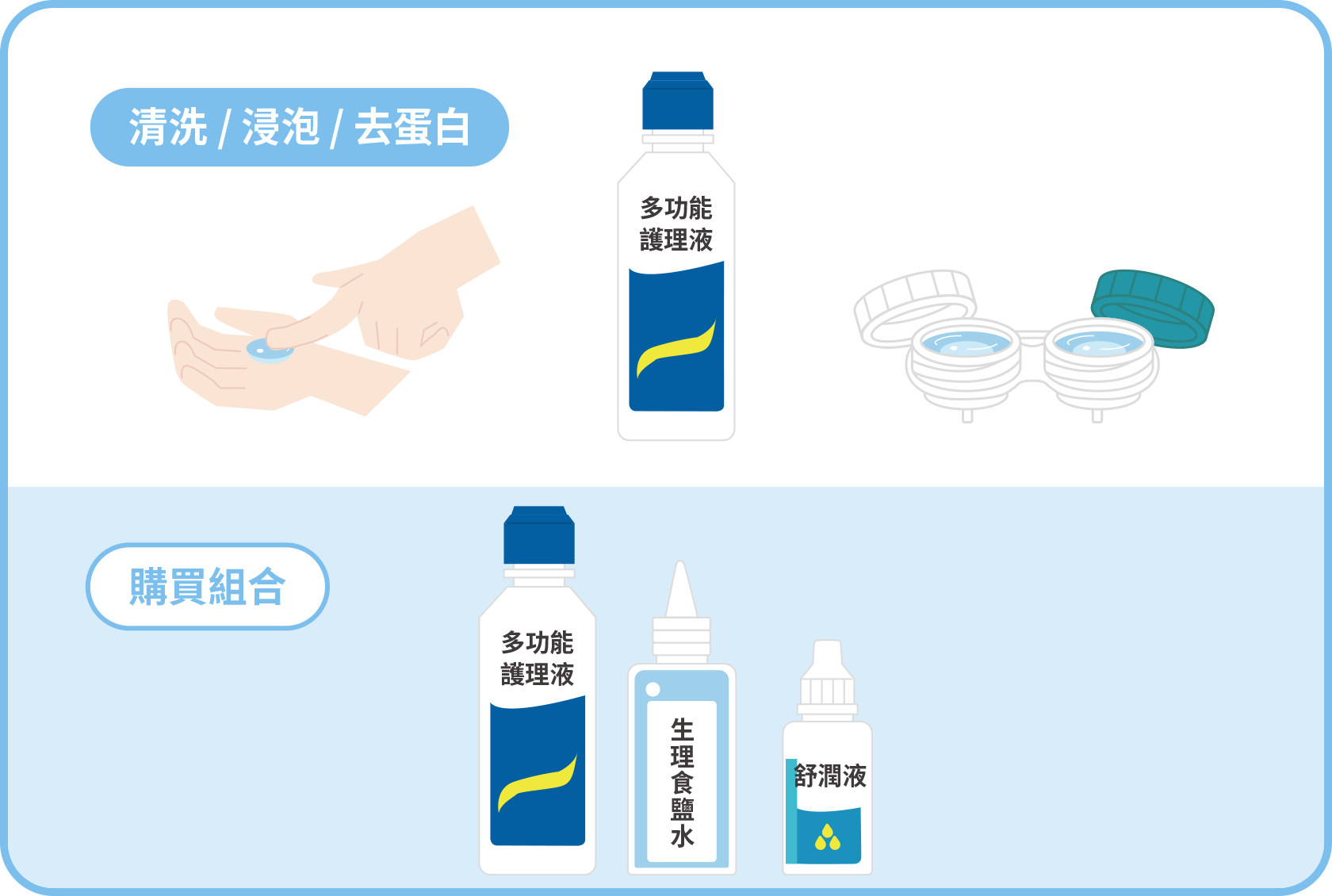 建議使用專用的酵素除蛋白清潔劑加強清潔 建議1周使用一次!但可以依照蛋白質沉積的情況增加使用次數,建議在回診諮詢眼科醫師後進行使用次數調整。