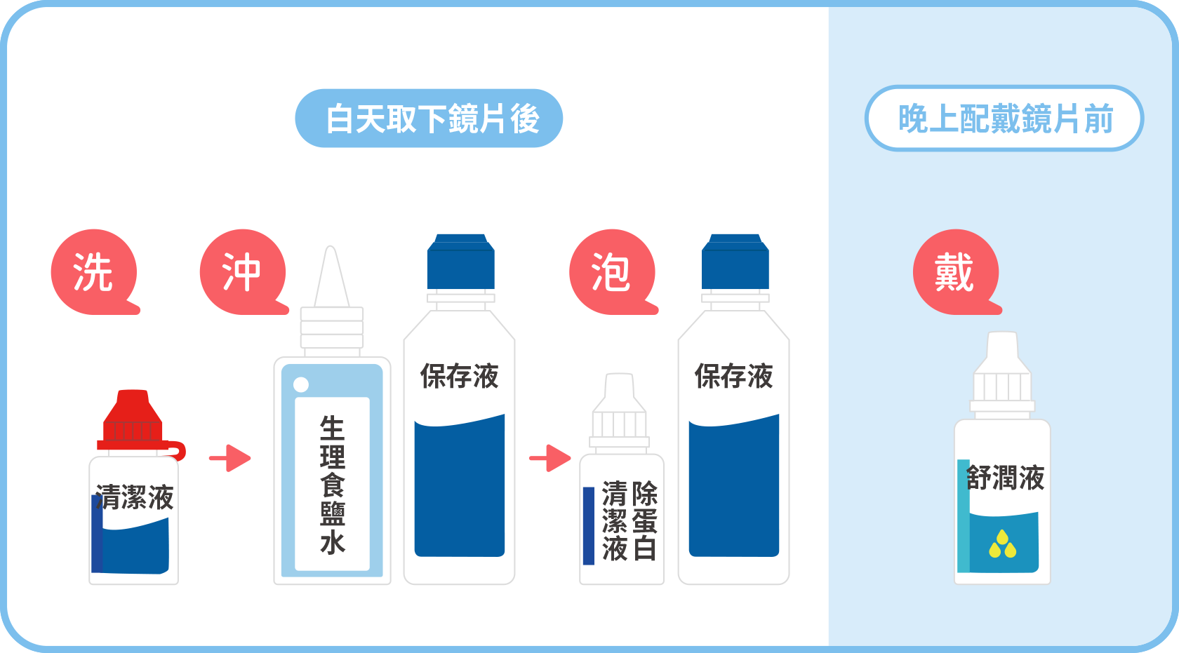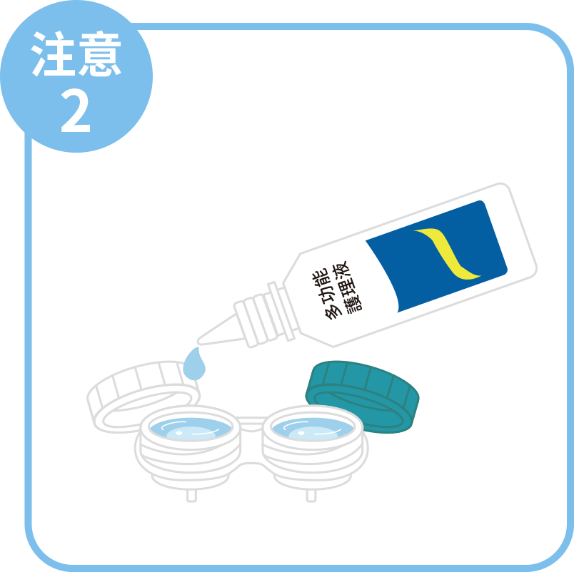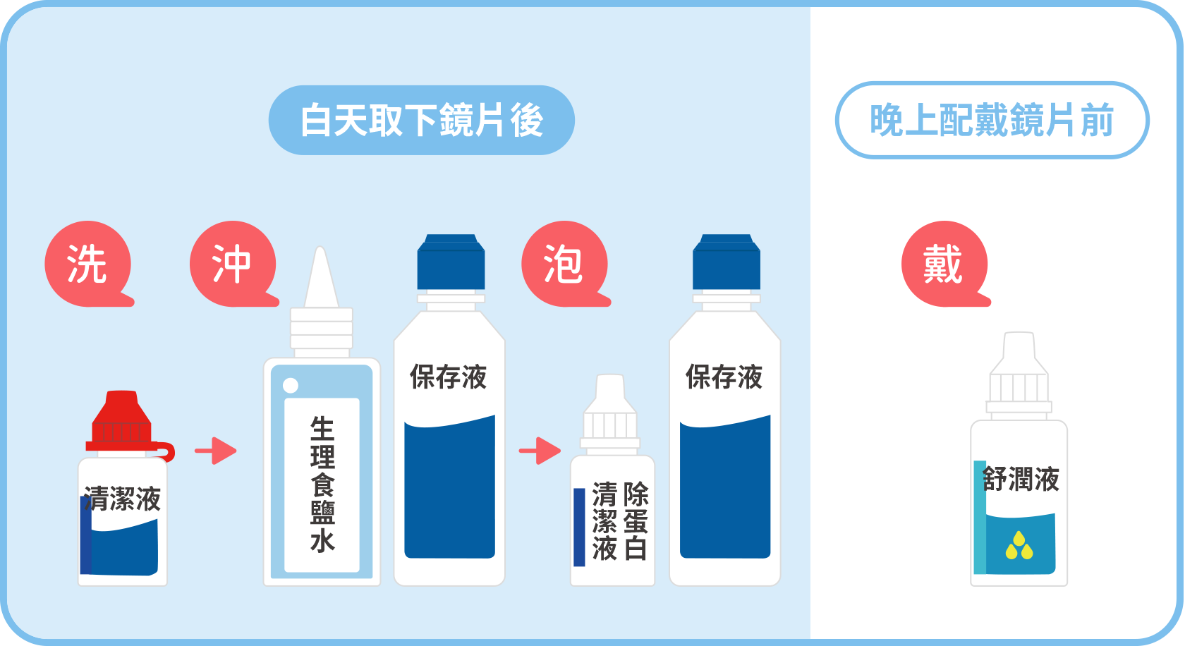 鏡片要使用專門的護理液或保存液浸泡,達到清潔消毒功能。鏡片取出水盒後,水盒要用護理液或保存液清潔並保持乾燥,建議每1-3個月更換一次水盒。