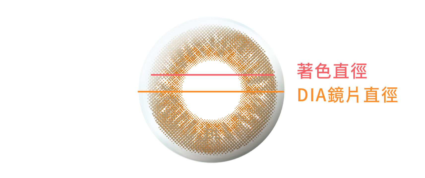 鏡片上印有顏色的範圍,也是挑選顯色狀態所代表的直徑。因為鏡片製造方式的關係,著色直徑不可能跟總直徑一樣。